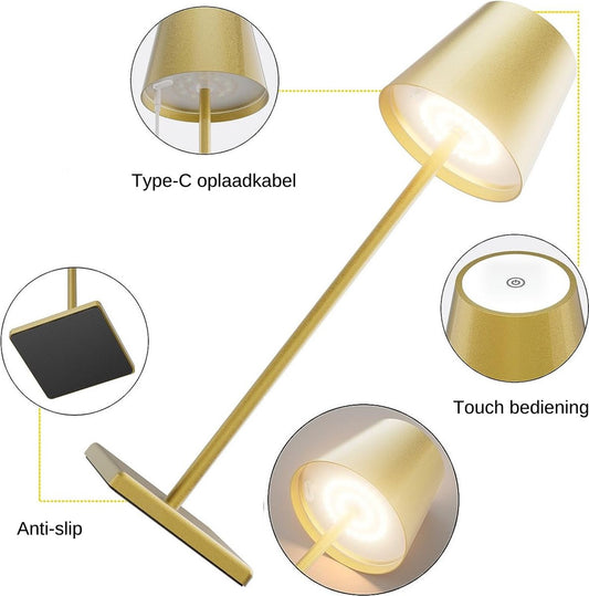 DreamGoods Oplaadbare Tafellamp - Draadloos & Oplaadbaar - Dimbaar - voor Binnen & Buiten - Touch Bediening - Tafellamp op Batterijen - Accu - Decoratie Woonkamer, Slaapkamer & Tuin - Industrieel - Goud