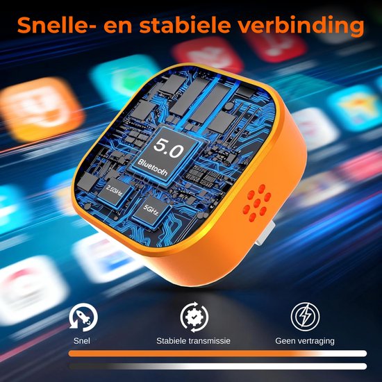 Na aansluiting van de adapter kun je je smartphone draadloos koppelen aan het scherm van je auto. Hierdoor zijn kabels niet meer nodig en blijven functies zoals navigatie, muziek en bellen beschikbaar via het autoscherm.