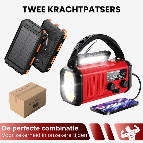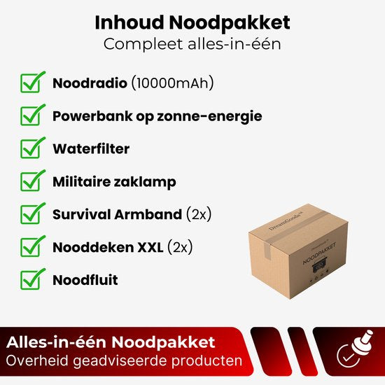 Dit DreamGoods noodpakket is samengesteld met praktische items voor momenten waarop netstroom niet direct beschikbaar is. Centraal staat een solar-/handopwindbare radio (10.000 mAh) met oplaadfunctie, zodat je radio kunt luisteren en kleine apparaten kunt bijladen wanneer dat nodig is.