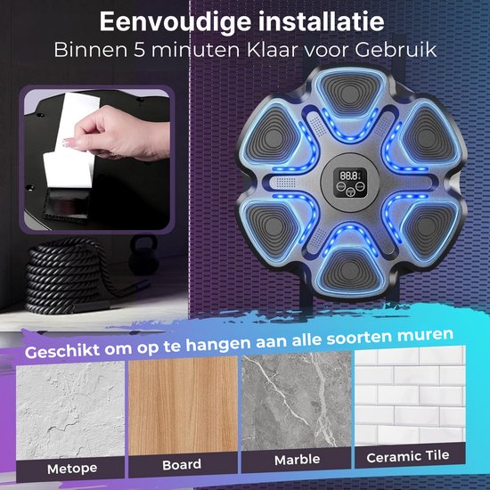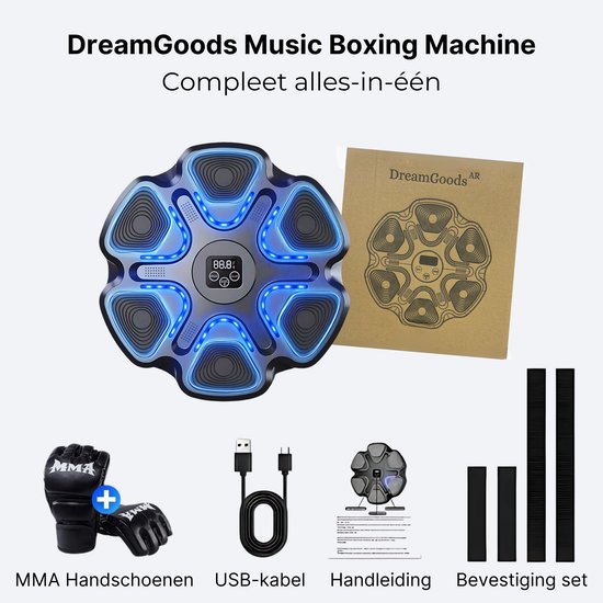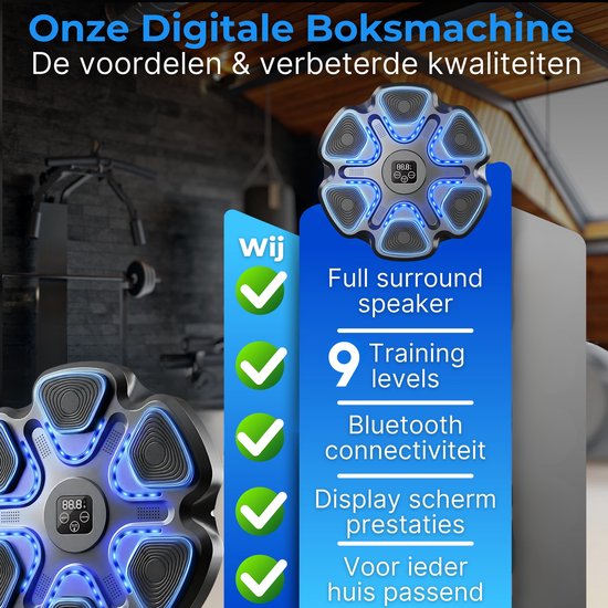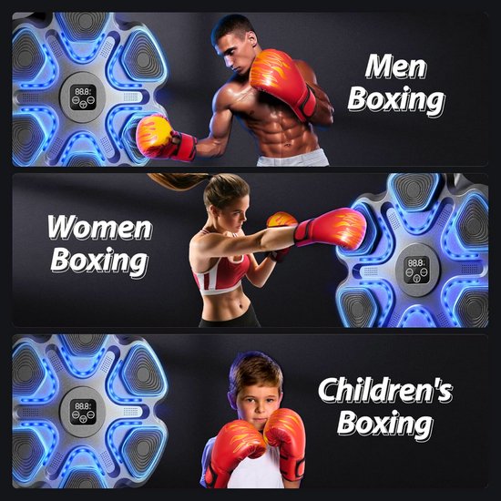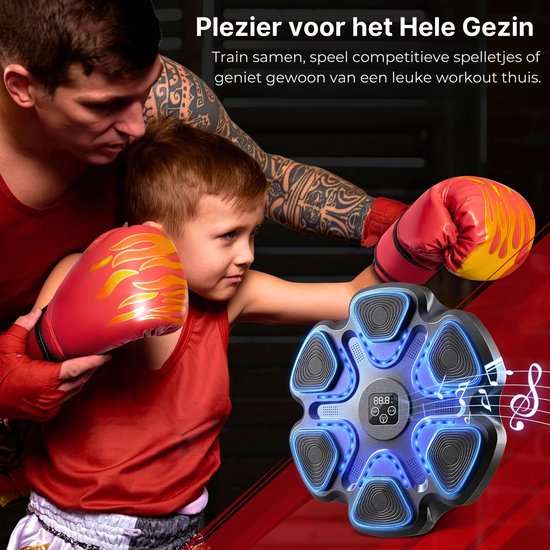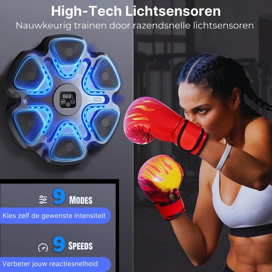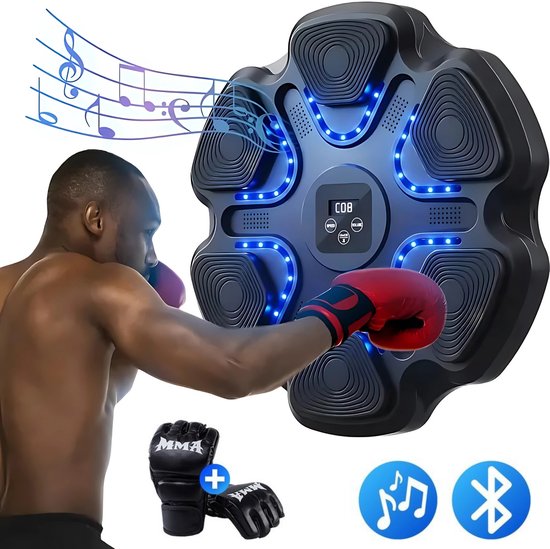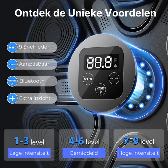 Bluetooth boks-trainingsmachine met 9 instelbare niveaus, LED-lichtfeedback en Bluetooth-audio voor trainen op muziek. Ontworpen voor thuisgebruik en geschikt voor beginnende tot gevorderde gebruikers.