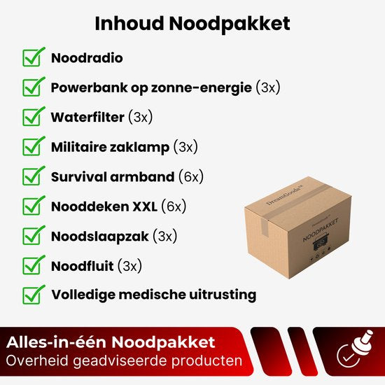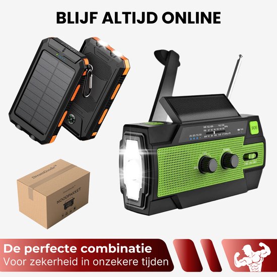 Dit DreamGoods noodpakket is samengesteld met praktische items voor momenten waarop netstroom niet direct beschikbaar is. Centraal staat een solar-/handopwindbare radio (4.000 mAh) met LED-licht en powerbankfunctie. Daarmee kun je radio luisteren, licht gebruiken en kleine apparaten bijladen wanneer dat nodig is.