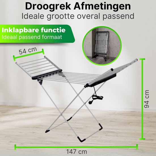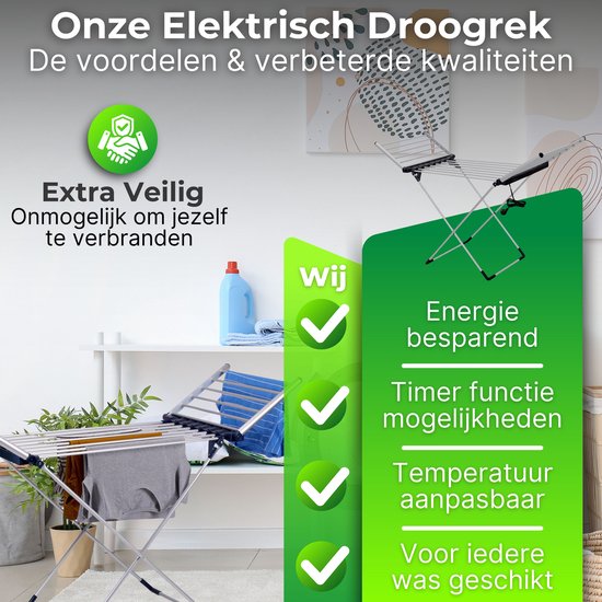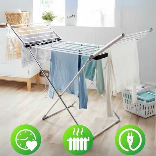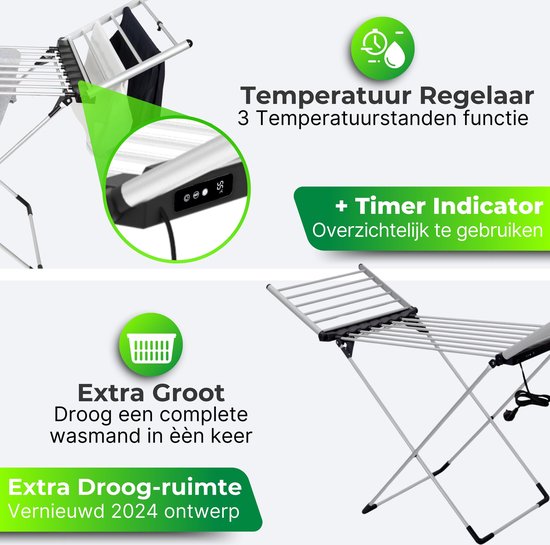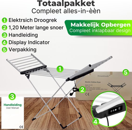Het DreamGoods elektrische droogrek biedt verwarmd drogen binnenshuis in een draagbaar, inklapbaar ontwerp. Stel eenvoudig de temperatuur (tot ca. 70 °C) en timer (1–9 uur) in. Een oververhittingsbeveiliging schakelt het toestel automatisch uit wanneer dat nodig is. Handig voor dagen waarop buiten drogen geen optie is.
