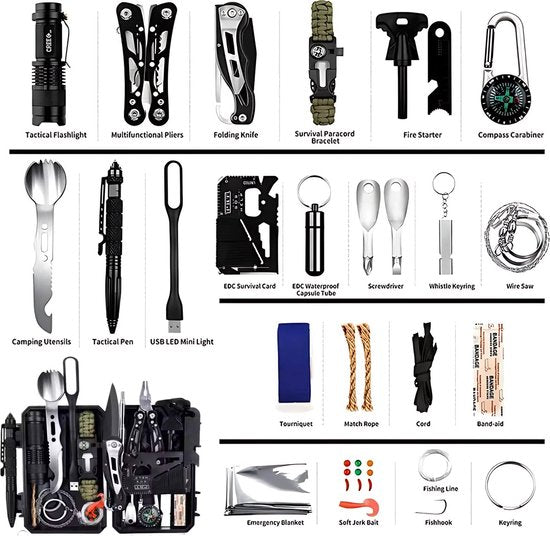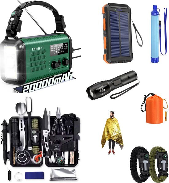 Naast de radio bevat het pakket aanvullende energievoorziening, verlichting, waterzuivering en warmte-artikelen. Alles is compact samengebracht en klaar voor gebruik.