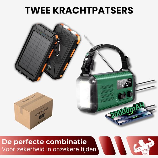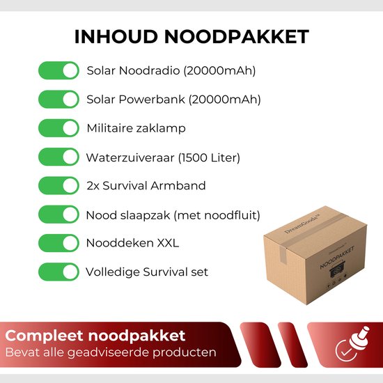 Dit DreamGoods noodpakket is samengesteld met praktische items voor momenten waarop netstroom niet direct beschikbaar is. Centraal staat een solar-/handopwindbare radio (20.000 mAh) met oplaadfunctie en licht. Hiermee kun je radio luisteren en kleine apparaten bijladen wanneer dat nodig is.