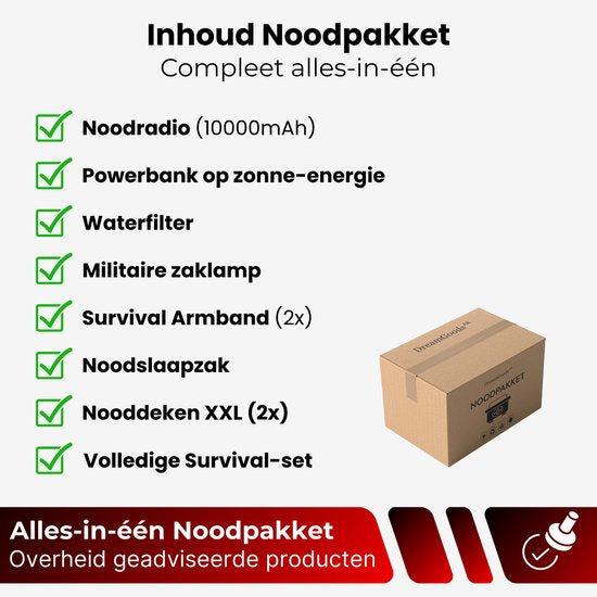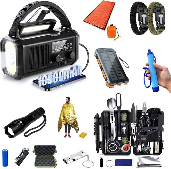 Daarnaast bevat het pakket aanvullende energievoorziening, verlichting, waterfiltering en warmte-artikelen. Alles is compact samengebracht en klaar voor gebruik.