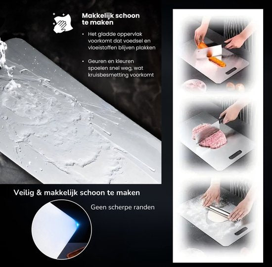 RVS is harder dan hout of kunststof. Houd je messen goed geslepen en snijd met gecontroleerde druk voor optimale resultaten. Leg desgewenst een theedoek onder de plank voor extra stabiliteit op gladde werkbladen.