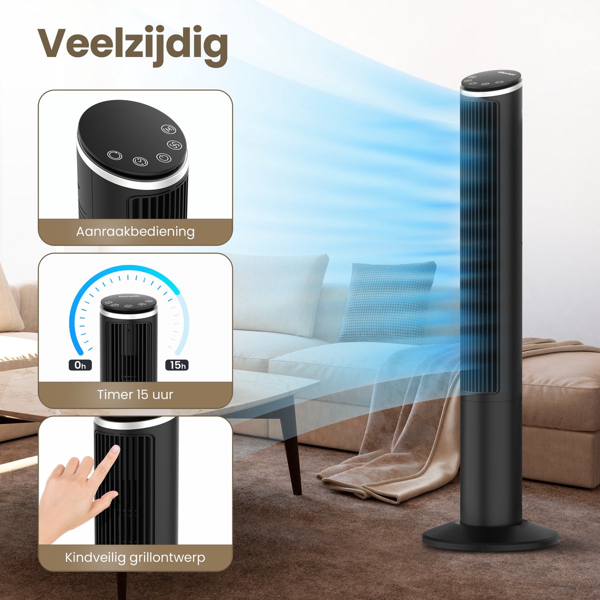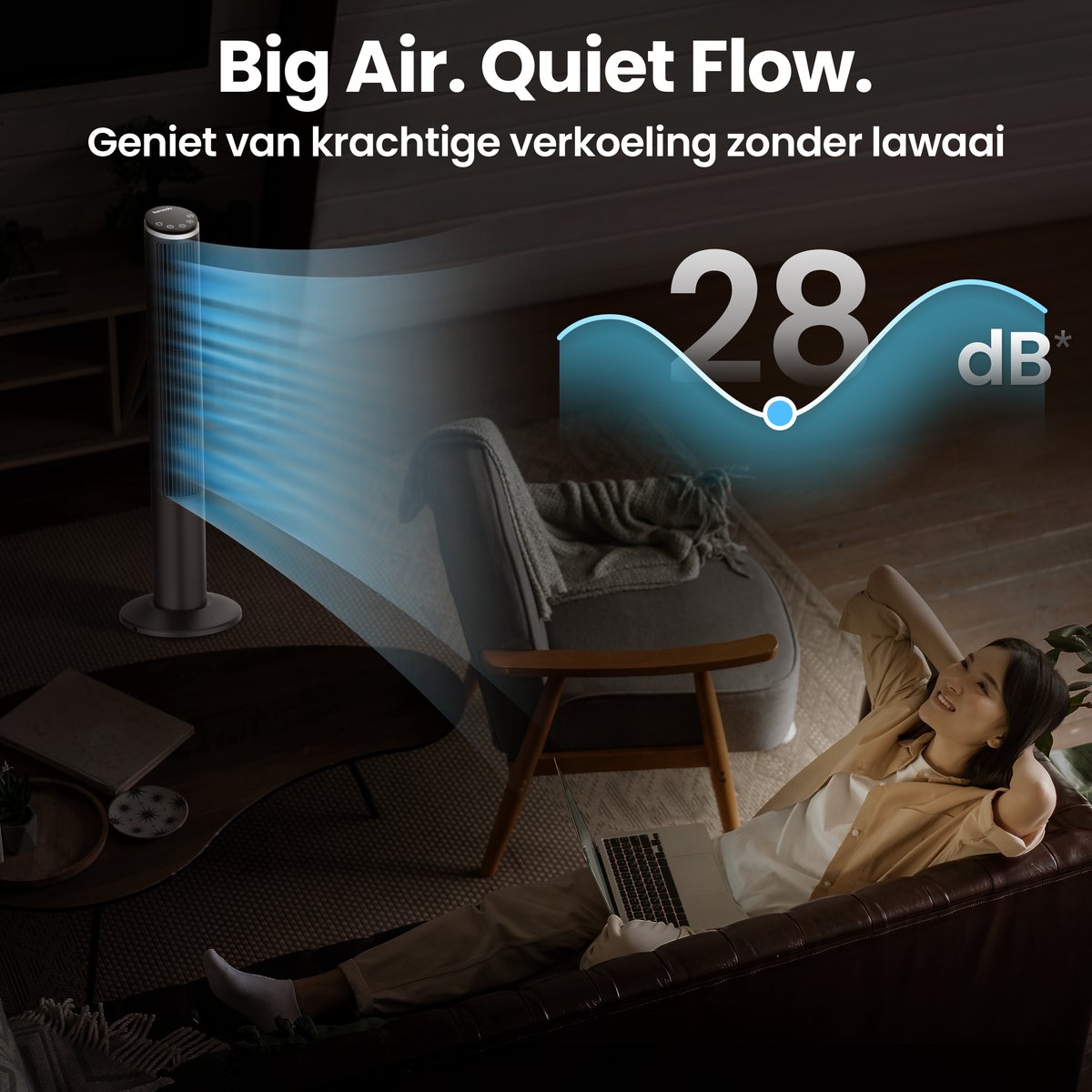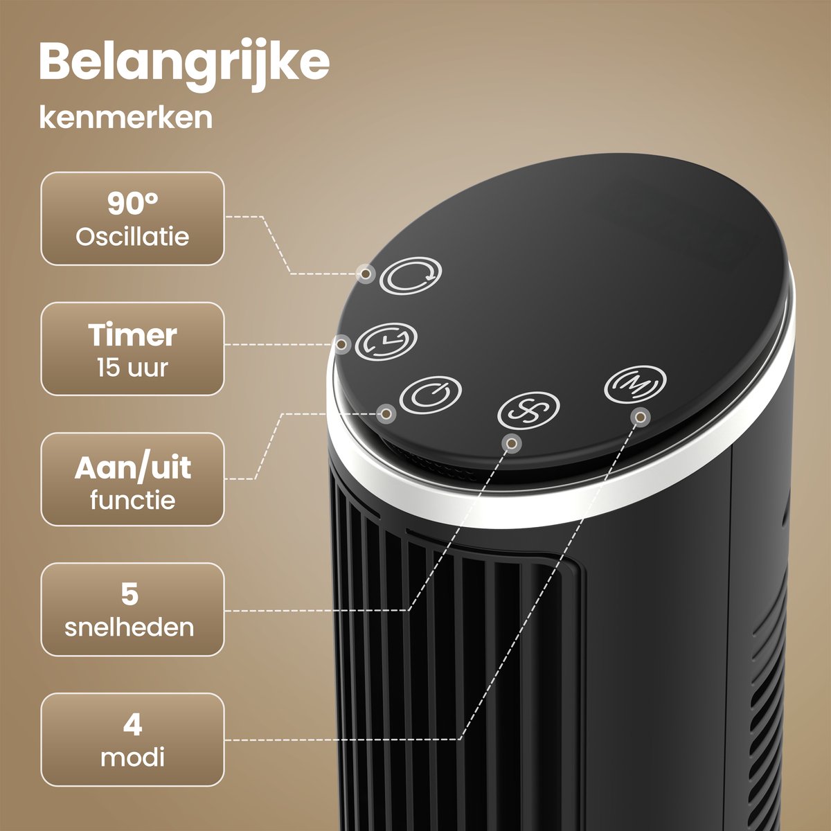 Het LED-display en de afstandsbediening maken bedienen eenvoudig; de timer helpt energie te besparen wanneer je de ventilator niet meer nodig hebt.