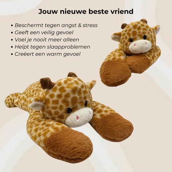 De DreamGoods verzwaarde knuffel – Giraffe (65 cm, 1,8 kg) is ontworpen voor een knus, geborgen gevoel. De zachte pluche afwerking en het subtiele gewicht zorgen voor extra comfort op de bank, in bed of onderweg. De lange, verzwaarde benen blijven prettig op schoot of over je schouders liggen.