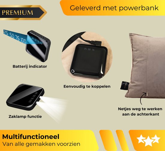 Het DreamGoods warmtekussen (45 × 45 cm) biedt comfortabele, draadloze warmte dankzij de meegeleverde powerbank. Kies uit drie warmtestanden en geniet van het zachte materiaal voor extra comfort op de bank, in bed of onderweg. De automatische uitschakeling draagt bij aan zorgeloos gebruik.